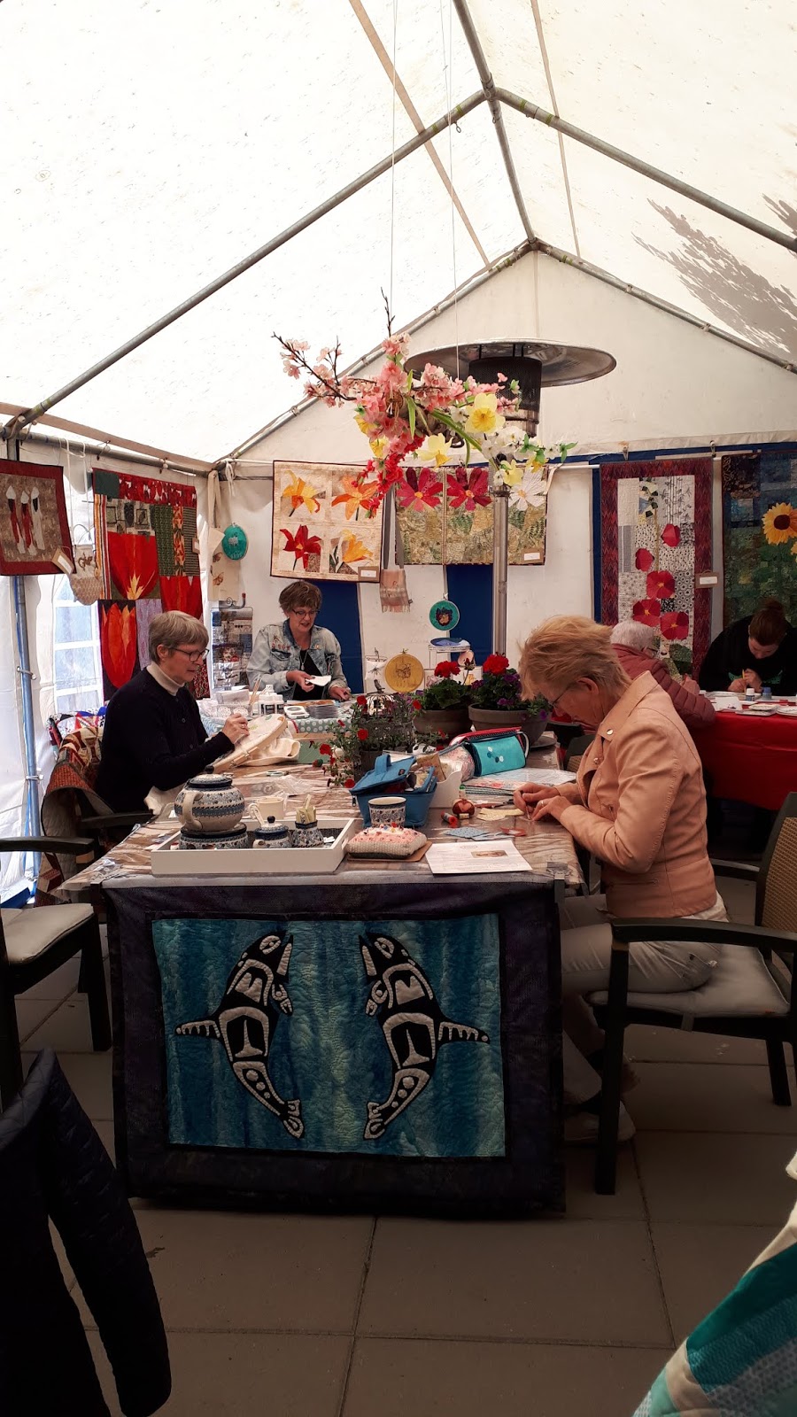 Er was een tentoonstelling van quilts uit eigen collectie van klanten en we mochten de collectie van Nardy Beltman lenen voor een expositie in onze workshopruimte.In de tent werden workshops gegeven . Angeline Faber van het nieuwe borduren was ook de gehele dag aanwezig met haar mooie stempels en gaf demo wat je zoal kunt doen met deze stempels.